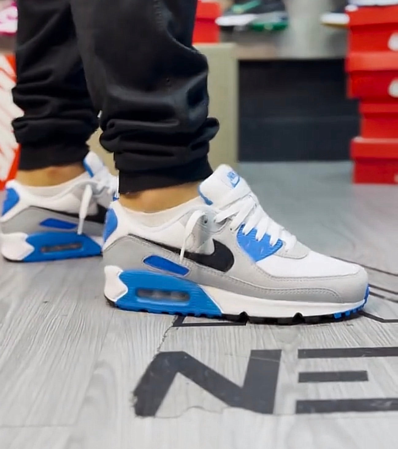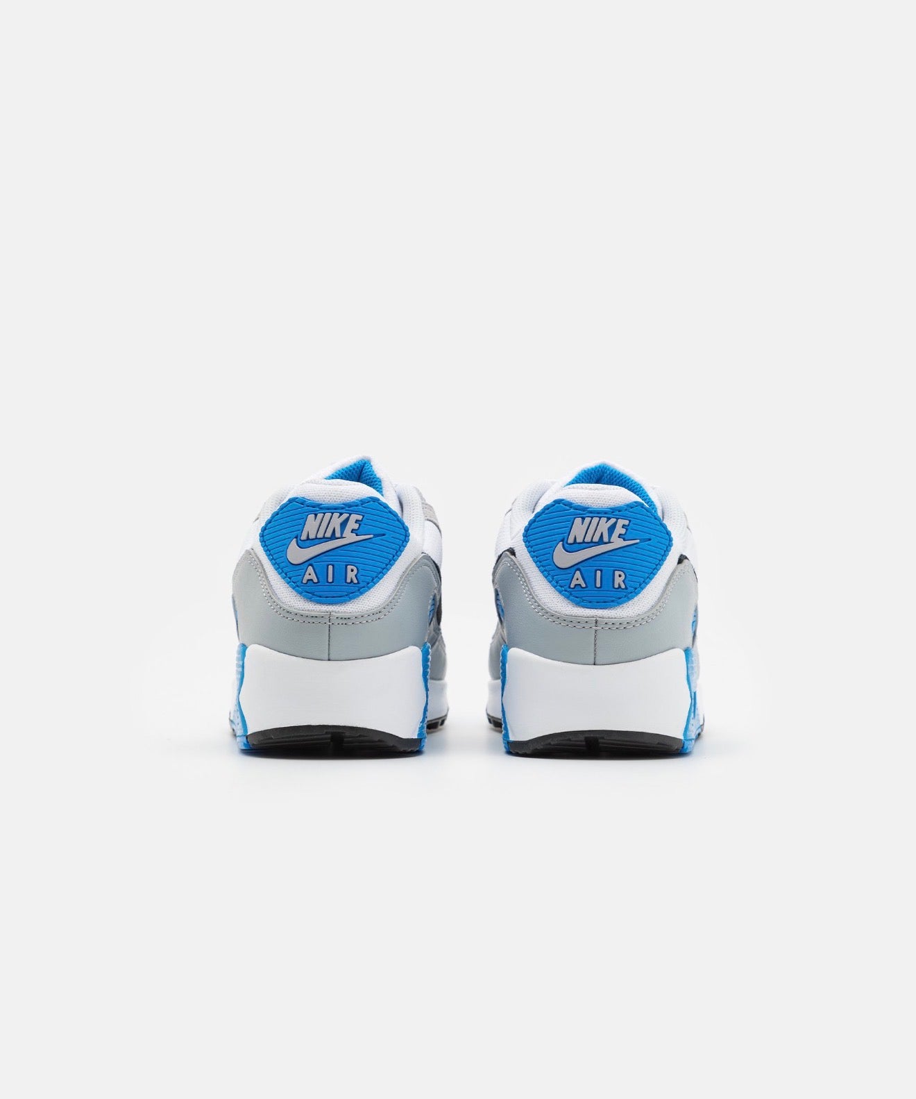 The Nike Air Max 90 is a classic sneaker with a clean and sporty look. This model comes in white, grey, and blue, a timeless color mix that works with any outfit.