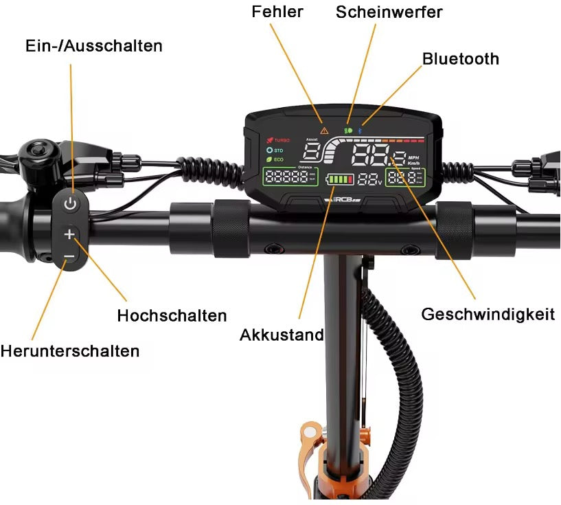 - Speedometer/Display: Digital LCD showing speed, battery level, power mode, and possibly trip data.